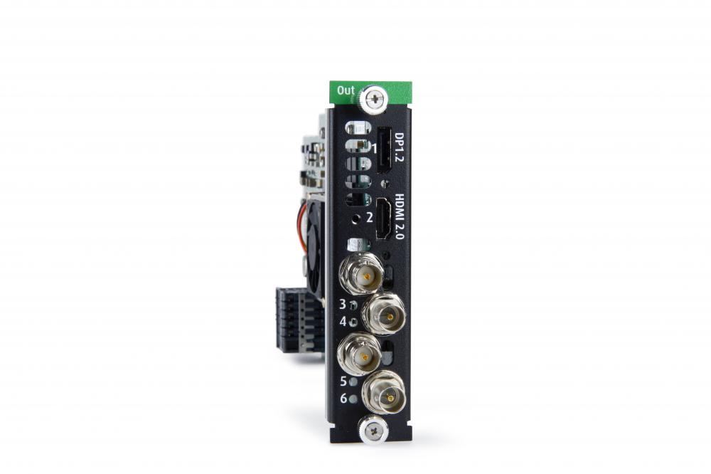 4K60p on a single cable The 4K Tri-combo output card (TCO) supports single cable 4K/UHD60p outputs via DisplayPort 1.2, HDMI 2.0 and 12G SDI. In addition, 4K/UHD 30p via 6G SDI is supported, as well as 4x 3G SDI, for both quad 4K/UHD or multiple HD SDI outputs. The output card is also backward compatible to DisplayPort 1.1a and HDMI 1.4a. Each card supports up to 4x HD, 2X Dual Link, or 1x 4K/UHD. Both the DisplayPort and HDMI output connections are HDCP compliant.|Full quality 4K@60p 4:4:4 on a single cable Support for output rotation of 90, 180, or 270 degrees Rugged modular design |