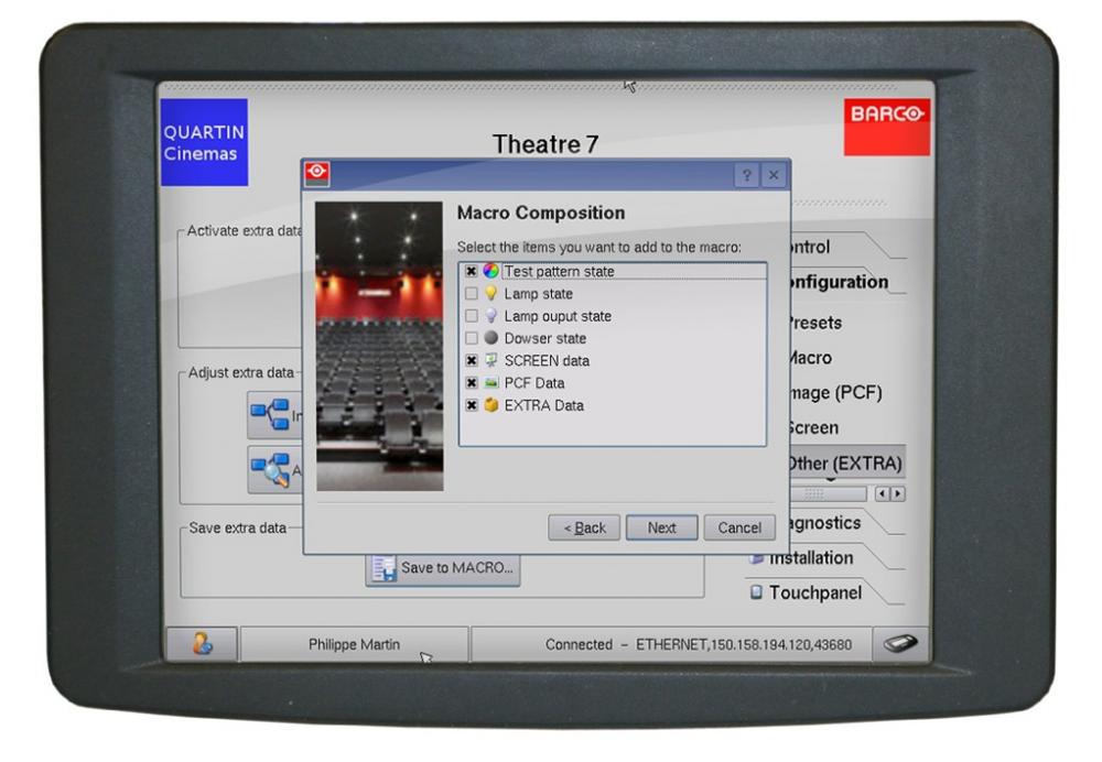 Enhancing the overall ease-of-use of the DP series, Barco introduces the new Communicator Touch Panel as a standard projector component across all models. Designed for multi-user command and control, the Communicator enables users to learn quickly and operate efficiently - using an elegant and flexible touchscreen interface. The interface's commonality means that operators can intuitively use any model in the product line, without restriction, and its user-friendly nature translates directly into a short and enjoyalbe learning curve. Key benefits Full version of Communicator software provided "as standard" Embedded PC version on the DP-1500, DP-2000 and DP-3000 "Touch" PC component is removable, enabling customers to use their own SMS (Screen Management System) display Elementary redundant keypad is available on the projector Provides "fingertip" control over the projector's lamp, dowser, test patterns, diagnostics, presets, ACS-2048, and server Optional integration of server GUI on the embedded PC Optional laptop "Communicator" version is available Cinema facility administrator defines user level and password for all operators Based on user login, software provides "trace" capabilities in case projector mistreatment Installers and "freelancers" can follow a Barco "DP Series Operations" training course. Upon succesful completion, personal user login is issued. |
