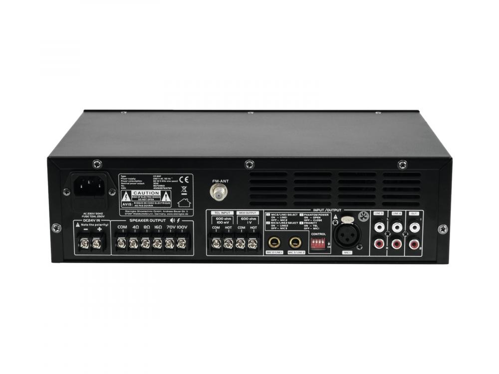 ELA-Mono-Mischverstärker mit Audioplayer und Bluetooth, 30 Watt -Kompakter ELA-Mono-Mischverstärker 1 x 30 W (CP-30P), 1 x 60 W (CP-60P), 1 x 120 W (CP-120P) -Integrierter Audioplayer mit Bluetooth-Empfänger und IR-Fernbedienung -Kabellose Musikübertragung von Ihren Musikgeräten (z. B. Smartphone, Tablet) über Bluetooth -SD-Kartensteckplatz und USB-Anschluss -FM-Tuner mit Auto Scan -3 Mikrofon-Eingänge mit getrennten Lautstärkereglern -Mic 1 (XLR) mit Phantomspeisung und Priority-Funktion -Mic 2 und 3 (Klinke) umschaltbar Mic/Line -2 Aux-Eingänge (Cinch) mit getrennten Lautstärkereglern -1 Telefon-Eingang mit Priority- und MOH-Funktion (Music on Hold) für Telefonzentralen mit Audioausgang -1 Line-Ausgang -Anschlüsse für 70-V- oder 100-V-ELA-Lautsprecher -Anschlüsse für niederohmige Lautsprecher (4-16 Ohm) -Bass-, Höhen- und Masterregler für das Ausgangsignal -4-fache LED-Pegelanzeige -Schutzschaltungen mit LED-Anzeige: Überlast, Kurzschluss, Clip-Limiter, Überhitzung -Netz- und 24-V-Notstrombetrieb -Tischgehäuse -Master-Equalizer: 1 x Regler 2-Band Mono -Stromanschluss: Stromeinspeisung Kaltgeräte (M) Einbauversion Stromanschlusskabel mit Schutzkontakt (M) (mitgeliefert) -Ansteuerung: IR-Fernbedienung (mitgeliefert) |