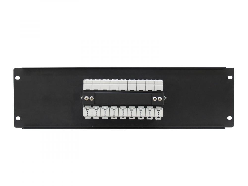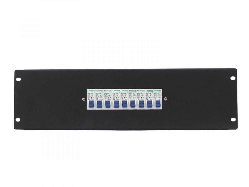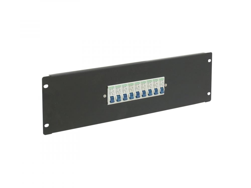 Stromverteilermodul für Rackeinbau -9 Sicherungsautomaten (16 A) -Schwarze Stahlfrontplatte -Maße (L x H) 483 x 132 mm (19", 3 HE) -Höheneinheit: 3 HE -Gehäusebauform: (19") 48,3 cm Rackeinbau -Stromanschluss: Stromeinspeisung Schraubklemme |