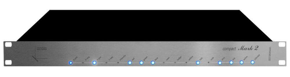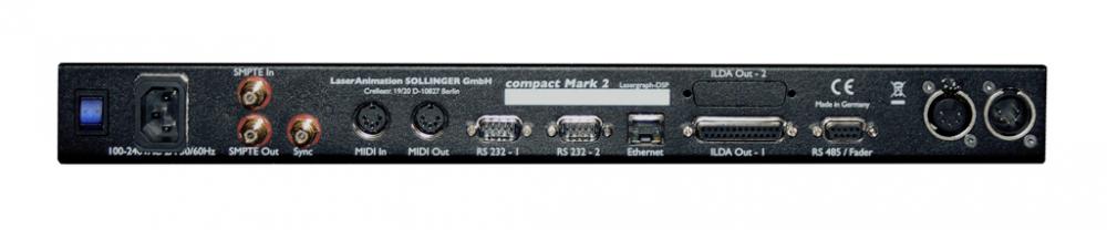 Das Lasergraph DSP Lasershow-Steuersystem, hergestellt durch Laseranimation Sollinger, wurde für hochprofessionelle Showanwendungen entwickelt. Die Lasergraph DPS-Systeme sind innerhalb der Showlaserindustrie gut etabliert und aufgrund des dezentralen Berechnungs- und Ausgabekonzeptes für Lasershows äußerst leistungsfähig. Ein spezielles Computersystem zur Programmierung der Lasershow ist nicht nötig - der Lasergraph DSP ist der Show-Computer! Die einzige Software, die zur Programmierung auf einem DSP-System gebraucht wird, ist ein kleines, wenige Kilobytes großes Programm, welches das DSP über eine Standard-IP-LAN-Verbindung steuert. Die Signalverarbeitung werden nebst allen Berechnungen, durch den Lasergraph DSP selbst durchgeführt. Diese dezentrale Datenverarbeitung macht die gesamte Showinfrastruktur unabhängig von externen Einflüssen, da Shows selbst dann gestartet werden können, wenn kein Computer mit dem DSP verbunden ist. Das ist auch dann möglich, wenn sehr komplexe Shows mit Timecode und DMX in/out Trigger gezeigt werden. Im Falle eines Stromausfalls kann das DSP unmittelbar danach die Show an der Stelle fortsetzen, an der die Unterbrechung erfolgte. Daneben ist der Lasergraph DSP innerhalb der Branche für seine hervorragende Ausgabequalität bekannt, die durch leistungsstarke Prozessoren erreicht wird. Timeline Laser Shows, Multi Media Shows und Live Laser Shows Die Laseranimation Lasergraph DSP ist ein leistungsstarkes Show-Steuersystem, mit dem nicht nur beeindruckende, vorprogrammierte Timeline-Shows erstellt werden können. Es ist außerdem möglich, viele zusätzliche Medien, wie DMX-Systeme, Videoinhalte, Spezial- und Wassereffekte anzusteuern. Professionelle Live-Lasershows werden ebenfalls häufig über Lasergraph-DSP-Systeme gesteuert, insbesondere da aufwendige Produktionen ausfallsichere und verlässliche Steuersysteme benötigen, die flexibel und kompatibel zur Nutzung von Timecodes (SMPTE) und Remote-DMX-Steuerung sind. Große Live-Lasershows werden häufig über mehrere DSP-Systeme gesteuert, die über LAN-Verbindungen miteinander verbunden sind und remote per DMX über eine GrandMA oder ähnlich professionelle Steuerungen, getriggert werden. Der Lasergraph DSP compact Mark 2 besitzt einen Ausgabekanal und ist in einem 19" Rack vebaut. |
