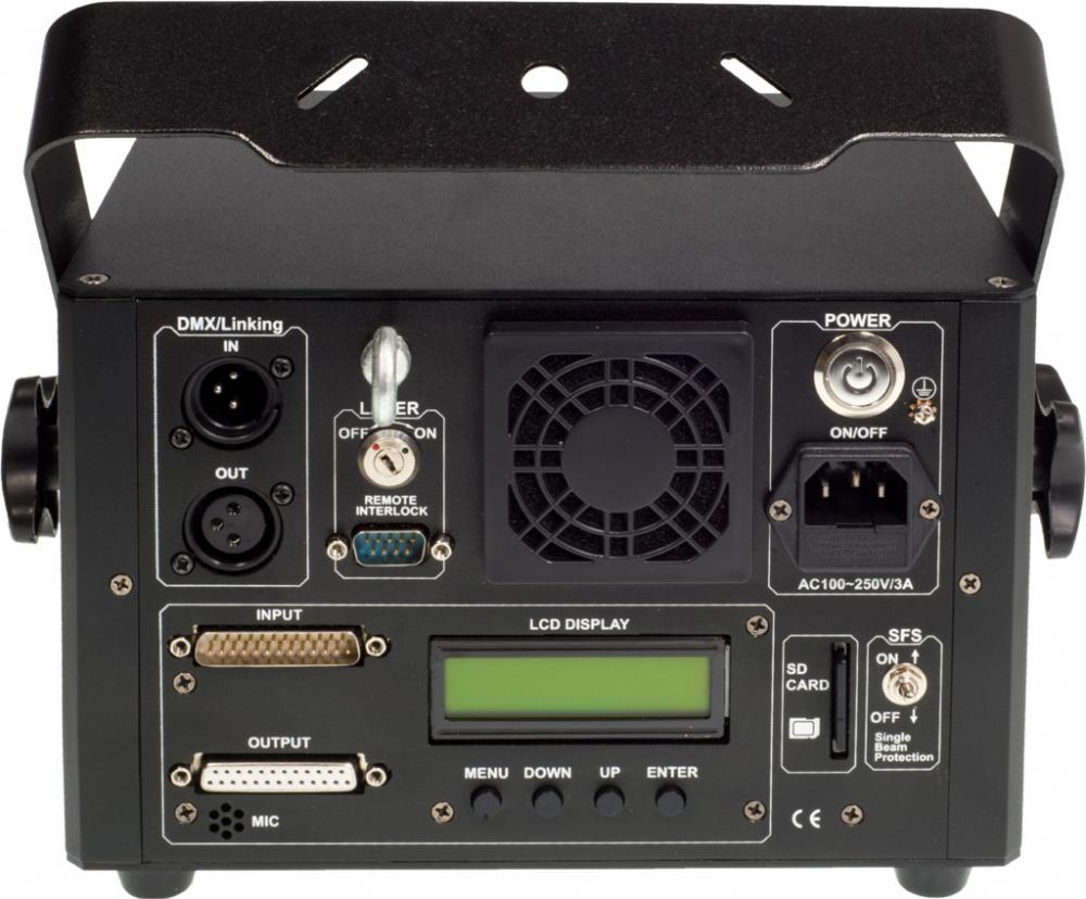 Der Laserworld PRO-800RGB ist ein Weißlicht-RGB-Lasersystem mit analoger Modulation und einer Gesamtleistung von bis zu 800 mW. Der Projektor ist nicht nur mit schnellen Scannern für flüssige Laserprojektionen ausgestattet sondern verfügt auch über das extrem helle Rot mit 637 nm, welches eine deutlich bessere Sichtbarkeit aufweist als das Rot mit 650 nm. Hinzu kommt ein dünneres und präziseres Strahlprofil. Der Laserworld PRO-800RGB ist daher sehr gut sichtbar und sowohl für Beamshows als auch für Grafikprojektionen bestens geeignet. Dieser Showlaser besitzt eine analoge Modulation, was einen verbesserten Farbverlauf und eine viel breitere Farbpalette gewährleistet. Diese Eigenschaften machen den Laserworld PRO-800RGB ideal für alle Arten von Laseranwendungen, bei denen viele verschiedene Farbtöne und -übergänge dargestellt werden sollen. Der große Vorteil der Projektoren der Proline Serie sind die integrierten Glas-Effekte, die über einen schnellen Stellmotor zusätzlich zum normalen Scanner-Modus eingeschwenkt werden können. Ähnlich einer optischen Bank sind zusätzliche Grating-Effekte möglich. Aber auch ohne die Effekte können faszinierende Lasershows und Grafikprojektionen gezeigt werden. Integrierte Effekte: Die integrierten Effekte können über das Display auf der Geräterückseite oder über einen DMX Controller ausgewählt werden. Zusätzlich können diese auch über ILDA angesteuert werden: - als fixer Effekt - über einen DMX Controller können die Effekte individuell angesteuert werden - oder im Automatik- oder Musikmodus. Hierbei erfolgt eine automatische Ausgabe der Effekte Proline Series Dip Switch Einstellungen: Normaler Scanner-Modus - für faszinierende Lasershows und Grafikprojektionen Burst-Grating-Modus - das dargestellte Muster wird großflächig vielfach multipliziert 3D-Effekt-Modus – macht aus dem dem jeweiligen Muster ein faszinierendes 3D-ähnliches Objekt Kreismuster-Effekt-Modus – das jeweilige Muster in der Mitte wird vervielfacht und in Kreisen um die zentrale Projektion herum wiedergegeben Line-Grating-Modus - das jeweilige Muster wird in einer Reihe vervielfacht Computer-Ansteuerung: Der Laserworld PRO-800RGB hat eine ILDA-Schnittstelle zur professionellen Computeransteuerung. Dadurch ist es möglich, eigene oder vorprogrammierte Lasershows mit Hilfe einer Lasersteuersoftware, wie z.B. Laserworld Showeditor, wiederzugeben. DMX-Modus: Über DMX können vorgefertigte Muster, wie beispielsweise Wellen, Tunnel, Kreise usw. in verschiedenen Farben und Geschwindigkeitsoptionen dargestellt werden. Automatik-Modus: Das Lasersystem besitzt einen Automatikmodus, der die vorgefertigten Muster automatisch wiedergibt. Musik-Modus: Wenn der Musikmodus aktiviert ist, projiziert der Laser im Rhythmus der Musik. Die Sensitivität des Mikrofons kann problemlos auf der Rückseite des Projektors angepasst werden. SD-Karte: Der Laserworld PRO-800RGB besitzt eine integrierte SD-Karten-Schnittstelle (eine SD-Karte ist im Lieferumfang enthalten). Muster, Animationen oder Shows können als .ILD-Dateien auf der SD-Karte abgespeichert werden und über den Projektor abgerufen und ausgegeben werden. Diese Option ermöglicht einen sehr flexiblen und computerunabhängigen Lasereinsatz. Laserworld Showeditor FREE: Der Laserworld Showeditor FREE ist eine kostenlose Lasershow-Software zur Erstellung von Mustern, Figuren, Shows und diese als ILDA (*.ild) Format zu exportieren. Es ist möglich, diese Dateien auf eine SD-Karte zu exportieren und über ein integriertes SD-Kartenlesegerät am Laserworld PRO-800RGB auszugeben. Die Laserworld Showeditor FREE Software kann hier heruntergeladen werden. Master-Slave-Modus: Neben den bereits aufgeführten Modi verfügt dieser Laserprojektor auch über einen Master-Slave-Modus. Showlaser derselben Serie (Slave-Projektoren), die via DMX mit einem Hauptprojektor (Master-Projektor) verbunden sind, geben bei diesem Modus die gleichen Muster aus, wie der Master-Projektor. Einstellungsmöglichkeiten auf der Geräterückseite: Auf der Geräterückseite des Systems befinden sich ein LCD-Display sowie Menüknöpfe mit denen eine Vielzahl von Einstellmöglichkeiten vorgenommen werden können, wie etwa die Modusauswahl, Grating-Effekte, Animationen, Farben, die Mikrofonsensitivität usw. Außerdem finden sich auf der Rückseite des Lasersystems neben dem Anschluss für die Stromversorgung und dem An/Aus-Knopf, die Schnittstellen für die Ein- und Ausgänge für DMX und ILDA sowie die Interlock-Schnittstelle. Ein integrierter Schlüsselschalter verhindert den Missbrauch des Lasers durch unbefugte Personen. Der Laserworld PRO-800RGB ist mit dem 'Scan Fail“-Schutz ausgestattet, der auf der Rückseite des Projektors ein- und ausgeschaltet werden kann. Ist der Schutz aktiv, wird verhindert, dass der Projektor einen konzentrierten Einzelstrahl ausgeben kann. Ein Mikrofon für den Musik-Modus und eine spezielle Befestigungsöse für ein Sicherheitsbefestigungsseil wurden ebenfalls integriert. IR Fernsteuerung: Eine Infrarotfernbedienung, die im Lieferumfang enthalten ist, ermöglicht diverse Auswahlmöglichkeiten, wie die für die Modi, Geschwindigkeit, Musterausgabe usw. Auf der Gerätevorderseite befindet sich eine LED, die blinkt sobald Signale der Fernbedienung empfangen werden. Die Ansteuerung über eine Fernbedienung ist gerade dann ideal, wenn der Projektor etwa auf einer Truss befestigt ist oder sich an einer schwer zugänglichen Stelle befindet. Das stabile Gehäuse des Laserworld PRO-800RGB ist extrem kompakt und hat die Maße von nur 23,5 x 20,5 x 16,5 cm (L/B/H). Ein ganz besonderes Merkmal des Gehäuses ist der Montagebügel, der es ermöglicht, das Gerät in fast jeder Position zu befestigen. Diese Eigenschaft macht eine schnelle und unkomplizierte Festinstallation sehr einfach. Der Laserworld PRO-800RGB ist mit roten und blauen Diodenmodulen und einem grünen DPSS Lasermodul bestückt. Die rote Diode hat eine Wellenlänge von