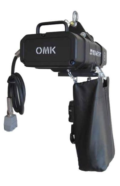 OMK electric chain hoists were developed in direct connection with Movecat‘s MPC EC1 and IC1 control systems so as to form with them a single unit offering the maximum in operational safety and functional versatility for professional BGV C1 point hoist applications. The high degree of functional safety, such as the targeted monitoring and supervision of the operational and emergency limit positions, underload and overload* (*optional), power supply and duty cycle of every individual hoist ensures reliable operation. The field of application is assistance with setting-up and dismantling operations in fixed installations and simple stage runs and scene changes, including the suspension of loads over human heads. In the basic configuration, the safety equipment comprises two independent DC brakes, an adjustable underload cut-out, a four-track geared limit switch, and a patented overload system for the protection of the drive and the chain. Continuous force and form closure without interruption between the brakes and the load as well as the safe suspension of the load are guaranteed under all circumstances and at all times. OMK hoists are equipped with an internal status and test board. This employs Movecat‘s ‚traffic light‘ principle to indicate without ambiguity the current operating status and contains the testing equipment required by DIN 56950 for the operating and emergency limit switches, load-measuring system and brakes. The standard version of the OMK hoists is equipped with a single eyelet suspension, with an integrated underload cut-out on the motor side, and with a hook on the chain side. The use of a special gear in connection with a chainbag wheel plus five or more chain-link bags makes smooth and quiet operation possible. Incremental and absolute encoders, thermal overload protection, dynamic load measuring systems, additional chain storage capacity and trolleys are available as options for OMK hoists. The modular component set permits cost-efficient, projectspecific adjustments even in the case of complex and highly exacting application and safety demands.
