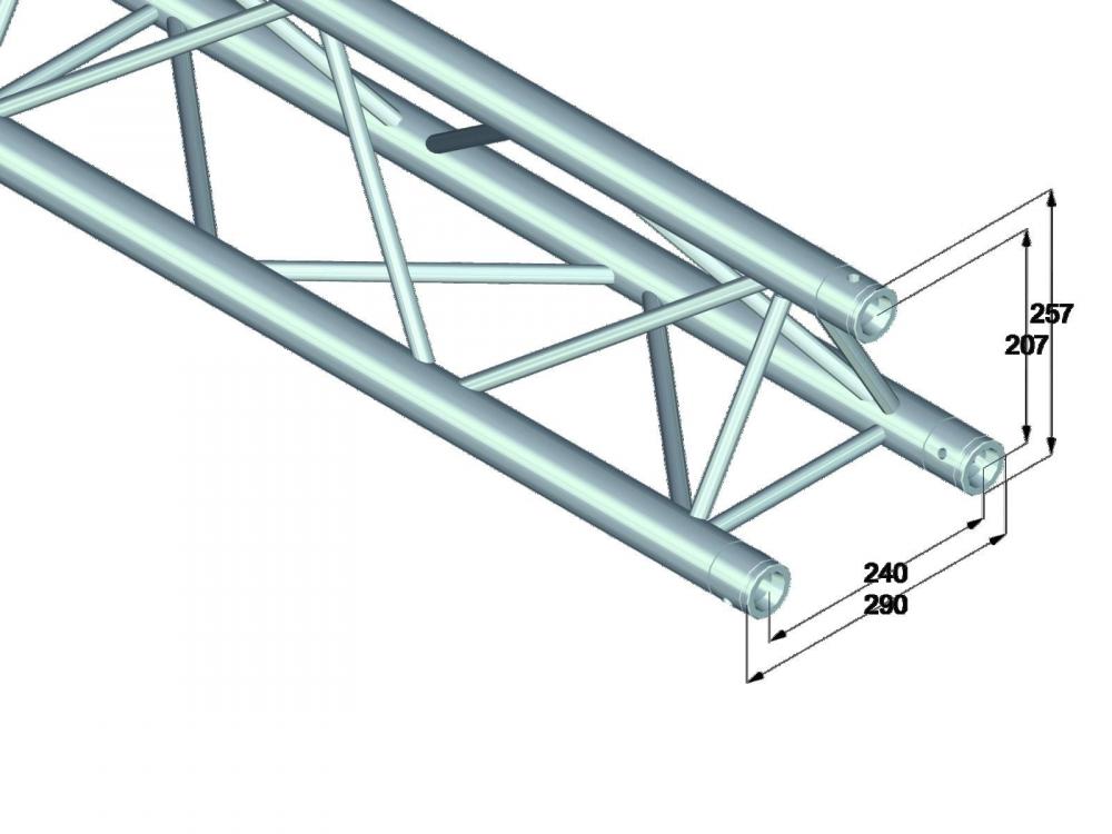 Main chords: 50 x 2 mm Braces: 16 x 2 mm Alloy: EN-AW 6082 T6 (AlMgSi1 T6) Welding material: AlMg 5 Welding technique: TIG-welding Outer dimensions: Width: 290 mm Height: 257 mm Length: 3000 mm Trusspipe: 50 mm x 2 mm Strut diameter x thickness: 16 x 2mm Color: Alu colored Weight: 10,7 kg Length: 3000 mm |