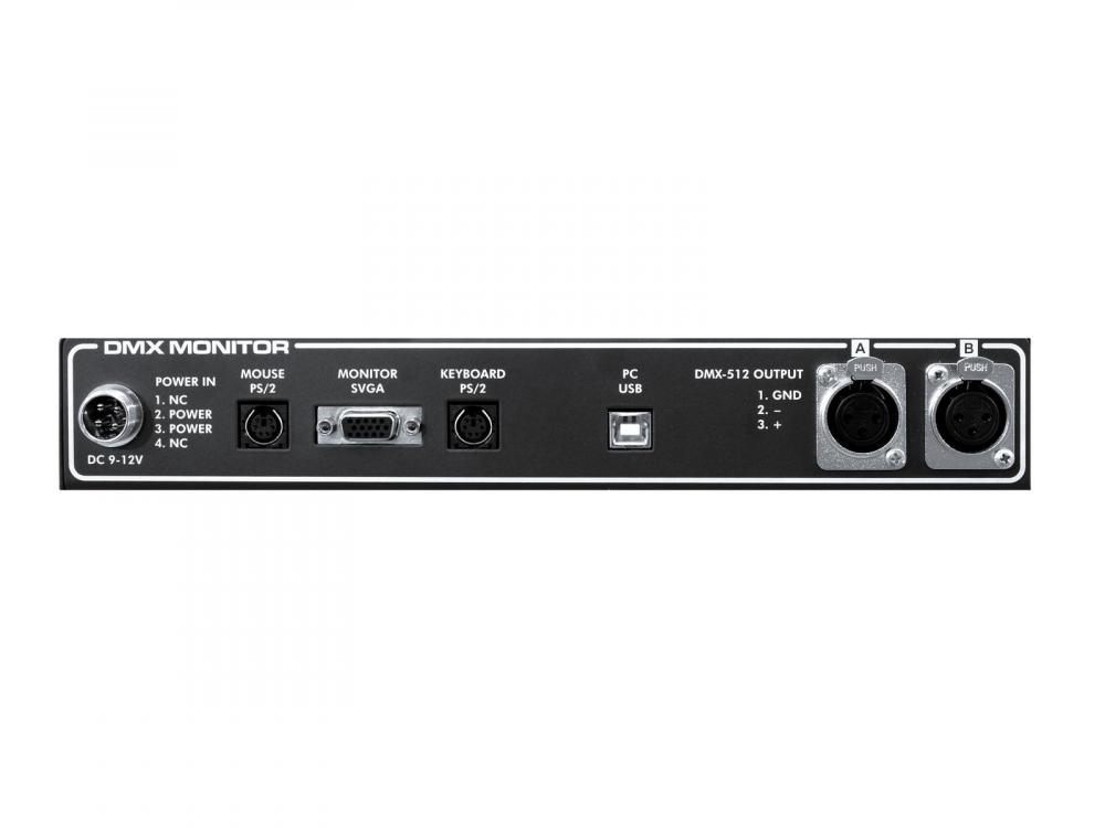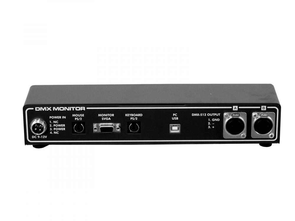 Comfortable DMX controller -For equipping simple DMX controllers with monitor, mouse, keyboard and PC connection -1024 control channels -3 working modes: DMX receiver (2 x 512 channels), DMX converter (1 x 512 channels), DMX controller (1024 channels) -Comfortable adjustement of different parameters -Change channel values -Group DMX-channels -DMX-channels can be inverted -Include virtual Master Fader -Built-in clock -Inputs: 2 x DMX512, Mouse PS/2, Keyboard PS/2 -Outputs: 2 x DMX512, Monitor SVGA, USB for PC connection -Recommended monitor resolution 1280 x 1024 pixels, 60 Hz -Case color: Black -Housing design: Interface -Made in Europe -Control: DMX |
