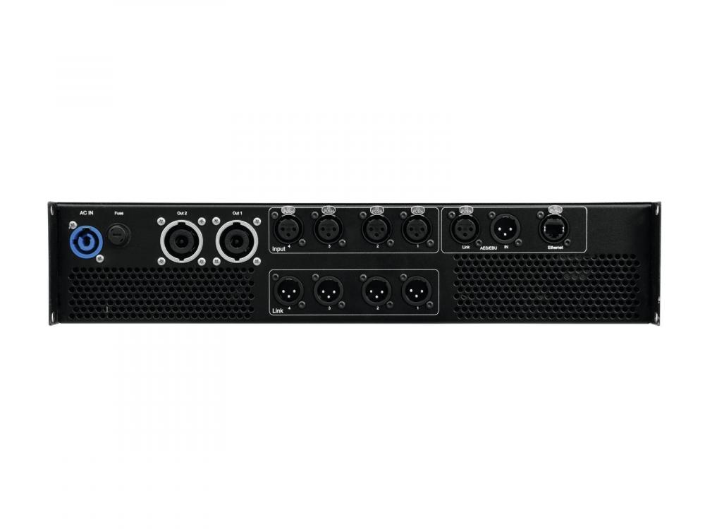 6 channel PA amp with SMPS, 2 x 2400 W, 4 x 800 W -6-channel PA amplifier with high-performance DSP, freely programmable -Sample frequency: 96 kHz and 64-bit technology -Premium components ensure excellent sound features -Efficient class D amplifier circuitry -2 Pascal amplifier modules -4 analog inputs and 2 digital AES/EBU interfaces (XLR) -4 analog link outputs (XLR) -2 Neutrik Speakon outputs -Neutrik Powercon mains input -Real-time remote control via built-in Ethernet LAN interface -User-friendly software for PC and Mac included -80 presets can be stored and activated -Manual control via encoder, LCD screen and buttons at the front panel -120 dB dynamic range -Flexible routing -10 parametric EQ -X-Over: Bessel, Linkwitz-Riley, Butterworth with 24 dB/octave -Delay -Limiter and noise gate -Phase reverse -Password protection -Low weight and height due to integrated switch mode power supply -Automatic power supply adaption between 100 and 240 volts without power selector -Intelligent mains fuse protection -Input current limiter -Protection against turn-on and turn-off transients -DC protection of outputs -Under and over voltage protection -Temperature-controlled air-cooling -High damping factor>1000 -Low distortion, THD+N -Rugged steel chassis with anodized aluminum front panel -Rack installation with 2 units -Windows XP, Vista, 7, 8 and Mac OS X 10.5.8 and better -Height unit: 2 U -Housing design: (19") 48,3 cm rack installation -Power connection: Mains Input Socket (M) Powercon (Power-In) blue Power supply cord with safety plug (M) (provided) |