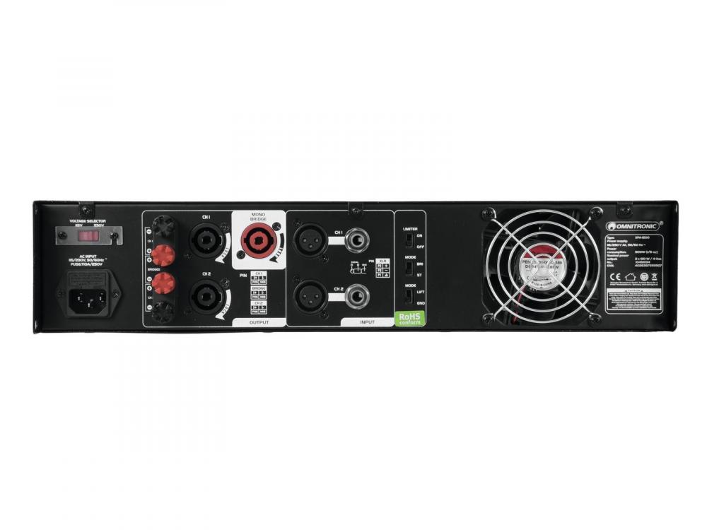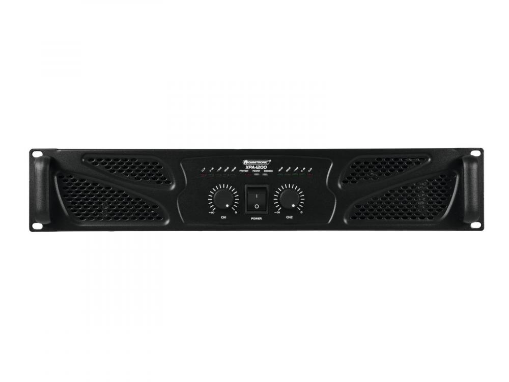 PA amplifier with integrated limiter, 2 x 600 W / 4 ohms, 2 x 420 W / 8 ohms -2 operating modes can be selected (stereo or bridged) -Limiter, switchable -Speaker switch-on delay -2 level controls -Each channel with LED for activated protective circuit (protect) and output meter with clip LED -Complete protection set against short-circuit, overheat, DC voltage, power on/off transients -Groundlift switch against humming -Fan cooling -Signal inputs via XLR or 6.3mm jack connectors -Speaker outputs via lockable speaker jacks and pairs of screw terminals -Additional Speaker plug for 8-ohm bridge operation -Class AB circuitry -Rack installation with 2 units -Housing design: (19") 48,3 cm rack installation -Height unit: 2 U -Power connection: Mains Input Socket (M) IEC connector (M) mounting version Power supply cord with safety plug (M) (provided) |