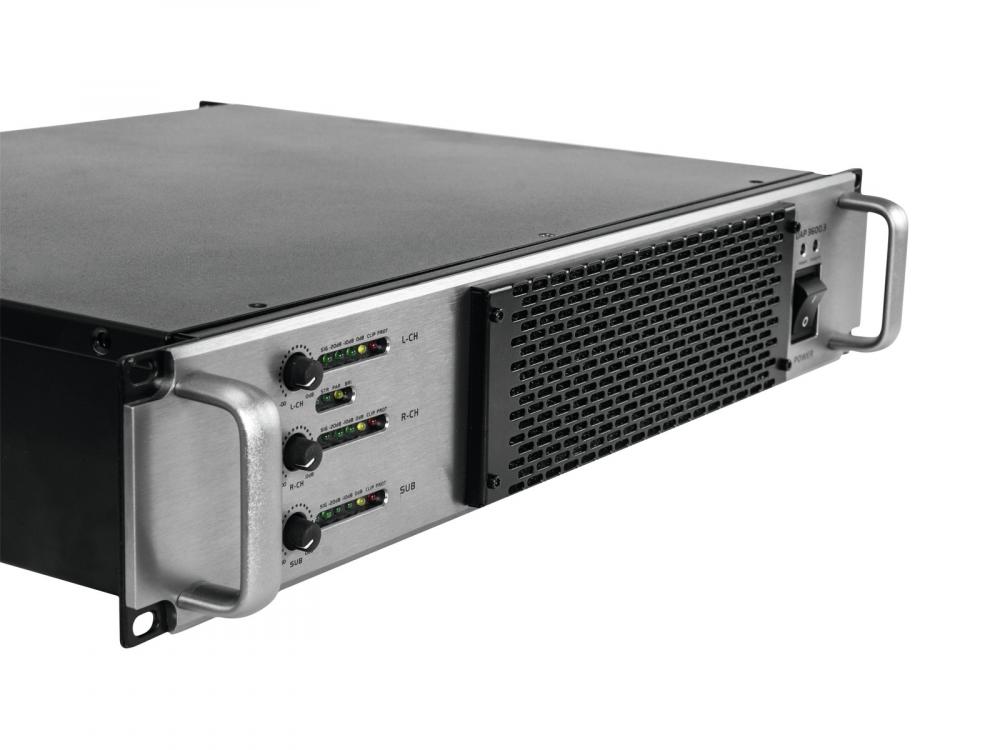 3-channel PA amplifier with crossover network - 4 ohms: 1 x 2000 W, 2 x 800 W -3-channel PA amplifier with class D circuitry and switch mode power supply -Adjustable crossover frequency for satellites and subwoofer -2.1 operation or 3-channel operation selectable -3 level controls -LED VU meter and LEDs for activated protective circuit (protect) and overload (clip) per channel -Electronically balanced inputs via XLR mounting jacks, with XLR feed-through outputs -Speaker outputs via lockable Speaker plugs -Rugged steel chassis with aluminum front panel -Rack installation with 2 units -Housing design: (19") 48,3 cm rack installation -Height unit: 2 U -Power connection: Mains Input Socket (M) P-Con (Power-In) Power supply cord with safety plug (M) (provided) |