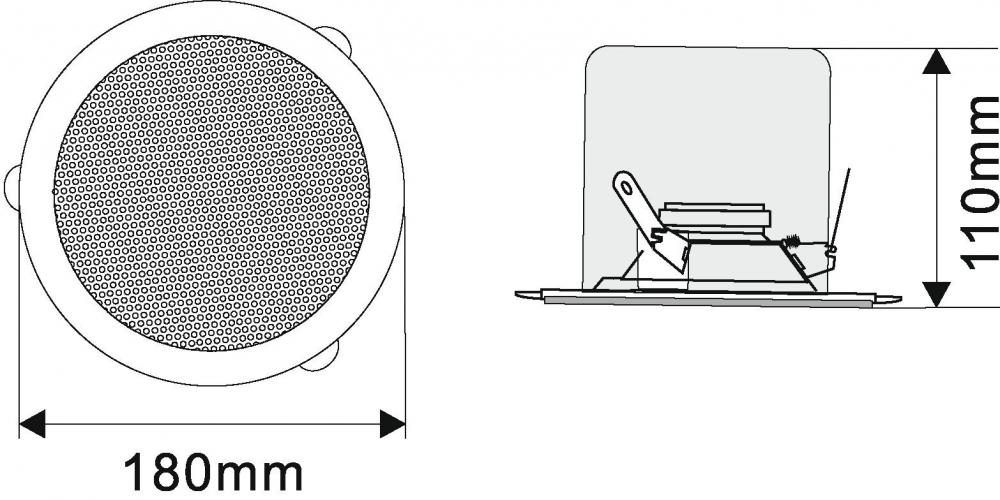 Input voltage: 100 V Components: 10 cm speaker (4") 6 W RMS (red) COM (black) Sensitivity: 90 dB, ±3 dB Maximum SPL: 94 dB Dimensions (D x D): 180 x 110 mm Mounting cutout: 150 mm ø Weight: 0,8 kg Size of woofer: (4") ca. 10 cm Rated power: 6 W RMS Program power: 12 W Frequency range: 150 - 15000 Hz Diameter: 18 cm Depth: 11 cm Impedance: 100 V ELA |