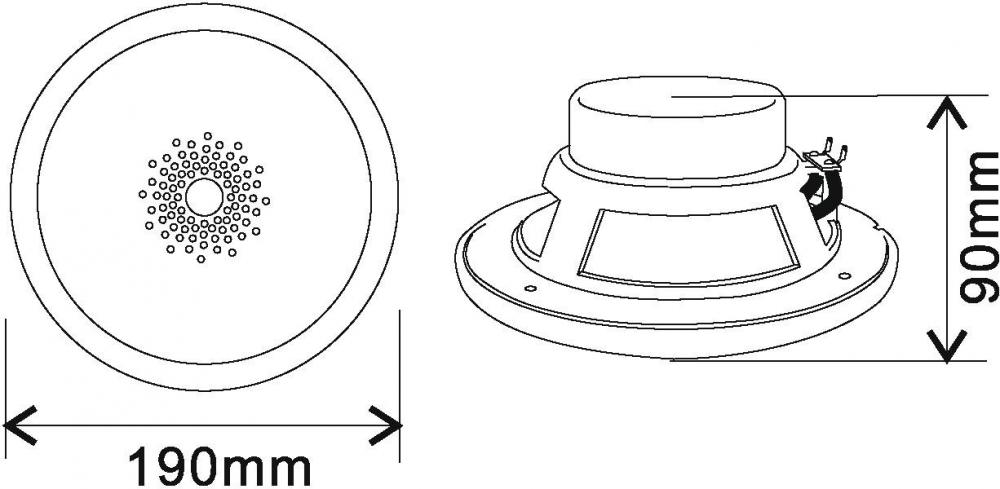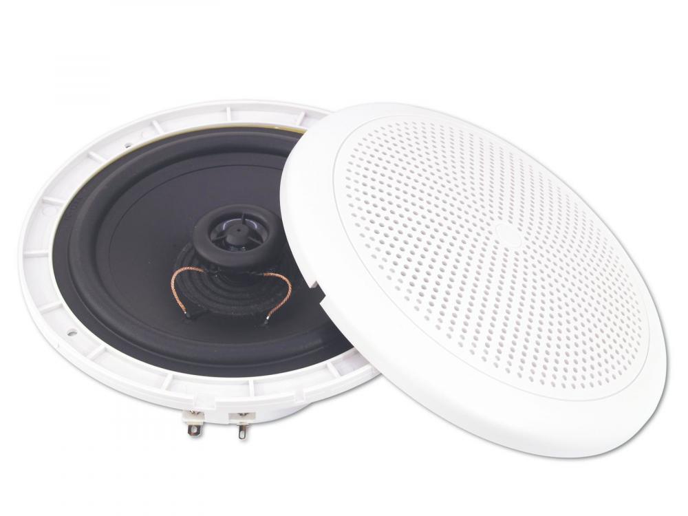 Weatherproof 2-way speaker, LF: 6" HF: 1", 25 W RMS / 8 ohms Ø 190 mm -2-way system with 6" bass speaker and 2.5 cm tweeter (1") -8 ohm speaker system -Splash-proof (IP44) construction for outdoor use -White plastic housing -Installation via drill holes in the housing -For outdoor and indoor amplifying systems |