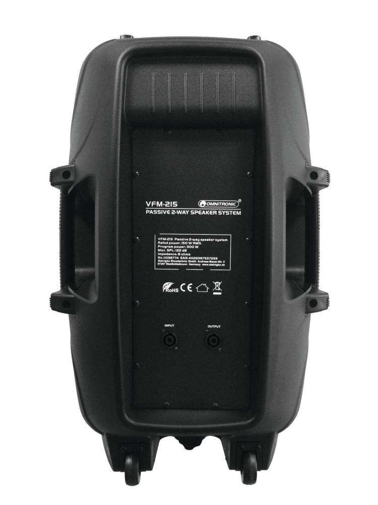 Passive speaker, 15" woofer, 1" driver, 150 W RMS, 8 ohms -2-way bass-reflex system with 38 cm woofer and 2.5 cm tweeter -Speaker connections -Stable plastic housing with protective grille and handles -Flange for stand installation -Can be used as floor monitor, standing, on a speaker stand or wall holder -For mobile live and DJ applications -Transport aid: Trolley |