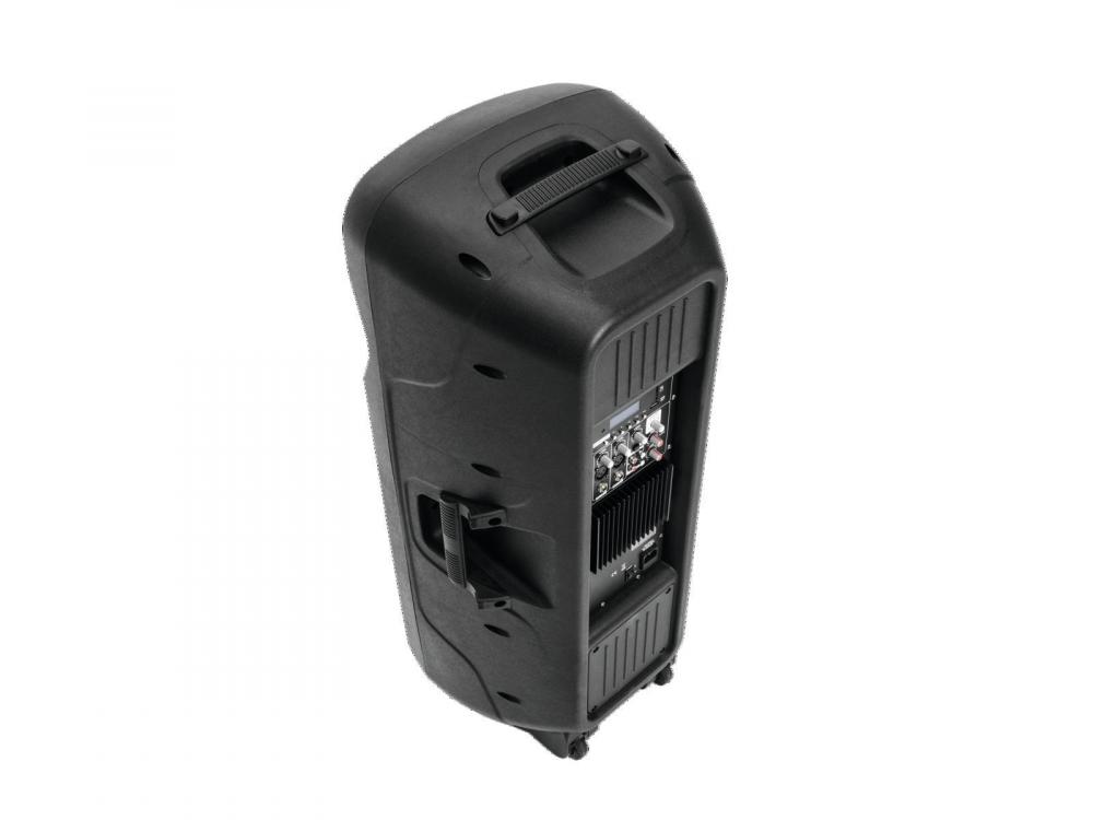 Speaker with 2 x 12" woofer, 1" driver, 150 W RMS player and Bluetooth -MP3 player with Bluetooth receiver, blue LCD and IR remote control -SD card slot and USB input -Stream music wirelessly from your mobile devices (e.g. smartphone, tablet) via Bluetooth -Class A/B circuitry: optimum sound and power at low weight and compact dimensions -2-way bassreflex system with 2 x 30 cm woofer and 2.5 cm tweeter -2 mic inputs with separate level controls -Line input, RCA -Master control with 2-way tone control, clip and power LED -Line output for linking further active speaker systems -2 wheels for easy transport -Stable plastic housing with protective grille and handles -Flange for stand installation -Can be used as floor monitor, standing, on a speaker stand or wall holder -For mobile live and DJ applications -Master equalizer: 1 x 2 band tone control -Transport aid: Trolley -Power connection: Mains Input Socket (M) IEC connector (M) mounting version Power supply cord with safety plug (M) (provided) -Control: IR remote control (provided) |