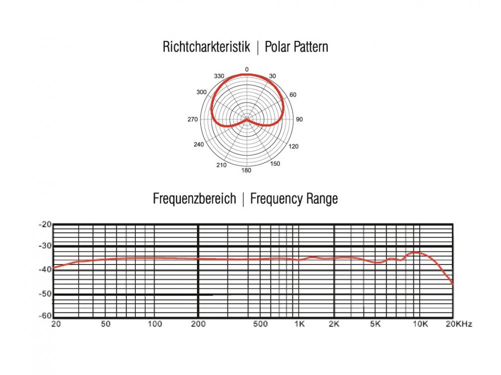 Type: Condenser Polar pattern: Cardioid Sensitivity: -36 dB (±2 dB) Output impedance: 250 ohms Load impedance: 1000 ohms Self noise: 18 dBA Maximum SPL: 135 dB S/N ratio: 76 dB Power supply: 48 V DC phantom power or 1.5 V battery (type AAA) Connector: 3-pin XLR Weight: 0,33 kg Polar pattern: Unidirectional Phantom power: 48 V DC; Or intern battery 1.5 V V DC Frequency range: 30 - 18000 Hz |