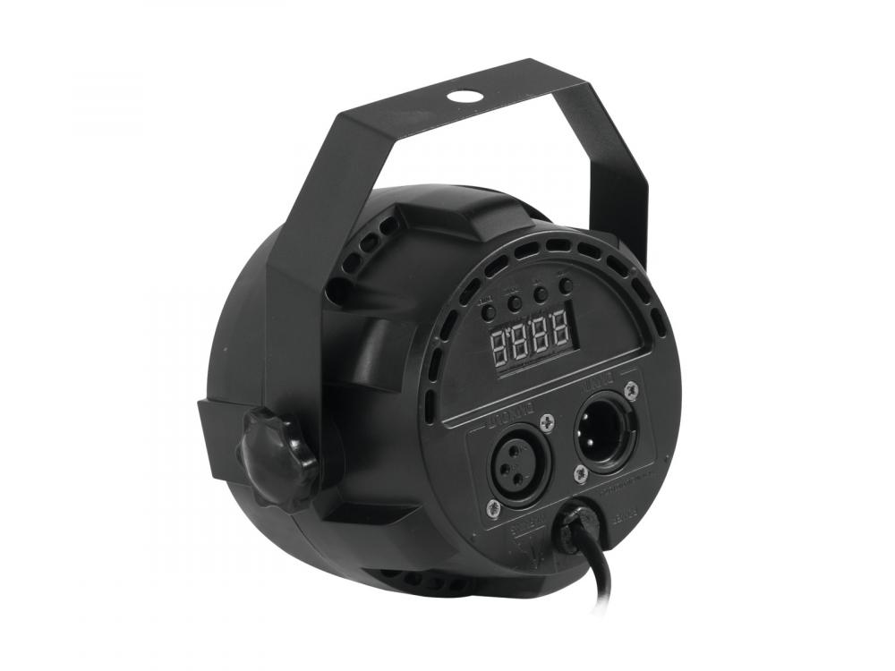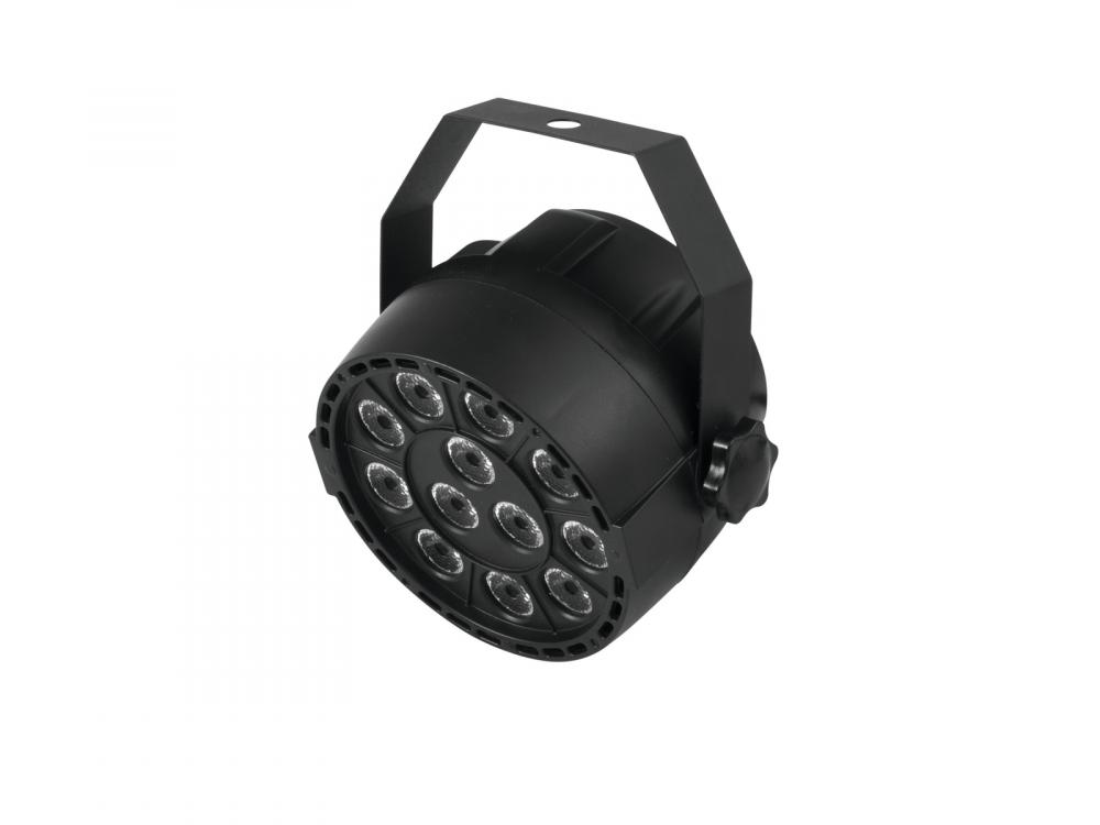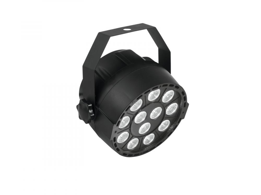 Compact spotlight with 12 x 3 W 3in1 LEDs in RGB and DMX control -Equipped with 12 high-power RGB LEDs (3in1) -Functions: static colors, RGB color mixture, internal programs, color change with diverse settings, dimmer and strobe settings, master/slave operation -Operable in stand-alone mode or via DMX -Addressing via control panel with 4-digit LED display -Sound-control via built-in microphone -Easy installation -Ideal for party-rooms and household use -Locking possibility at the mounting bracket -Ready for connection via power cord with Euro plug -Switch-mode power supply for operation between 100 and 240 volts -DMX512 control possible via any commercial DMX controller (occupies 5 channels) -Case color: Black -Effect: Strobe effect -Power connection: Fix Power supply cord with Euro plug (M) -Projection: flicker-free -Control: Stand-alone; DMX -LED: 12 x high-power 3 W 3in1 TCL RGB (homogenous color mix) |