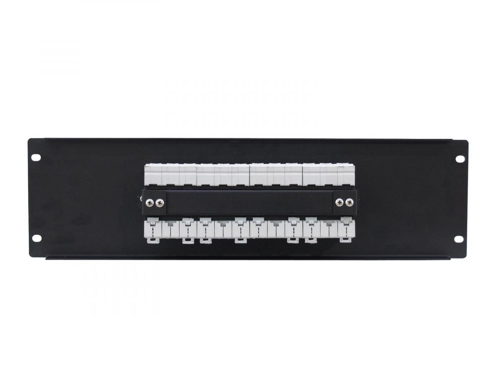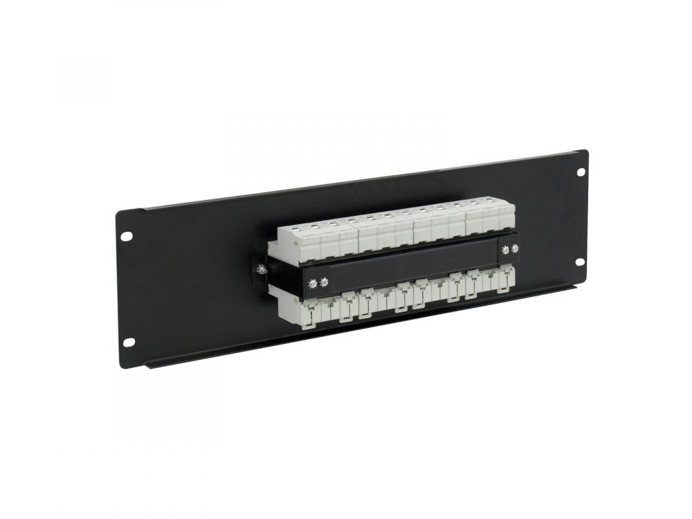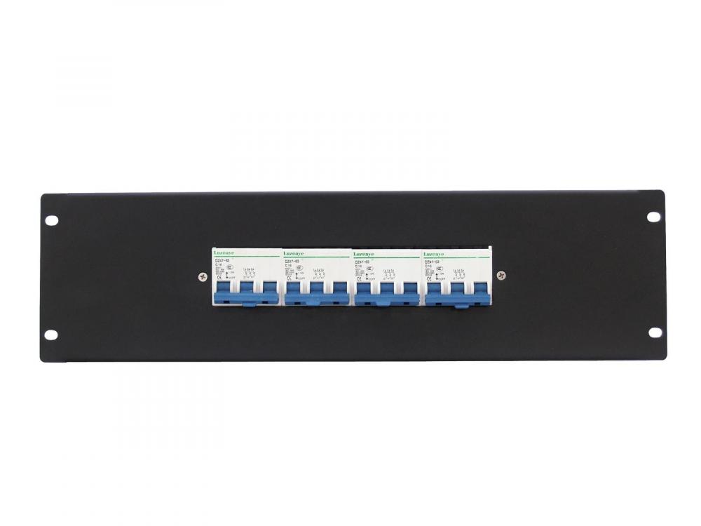 Power distributor module for rack installation -4 fuse breakers (16 A) -Black steel front panel -Dimensions (L x H) 483 x 132 mm (19", 3 U) -Height unit: 3 U -Housing design: (19") 48,3 cm rack installation -Power out: Screw terminal -Power connection: Mains Input Socket (M) Screw terminal |