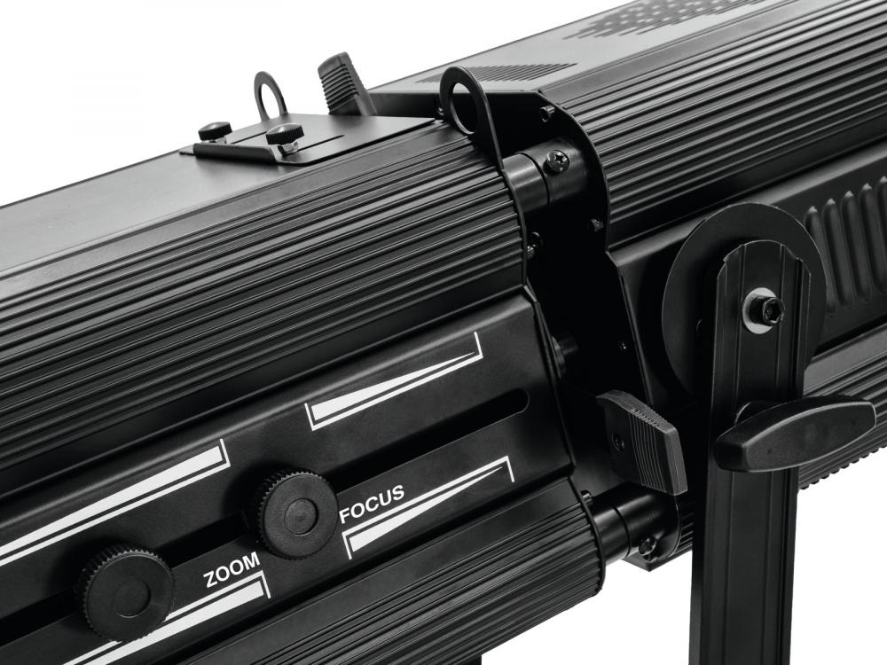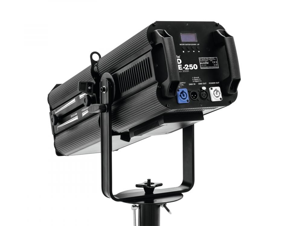 PRO profile spotlight, 250 W warm white LED, zoom, shutter blades, CRI >90 -Equipped with 1 x 250 W COB LED in warm white -Ideal for theatres and stages -Operable in stand-alone mode or via DMX -DMX512 control possible via any commercial DMX controller (occupies 3 channels) -Comfortable addressing and setting via control board with LCD display and four operating buttons -Master/Slave function -Strobe effect -Dimmer -Dimmer speeds (step response) adjustable via DMX -CRI of >90 -Focus manually adjustable -Manually adjustable zoom -Color filter frame and 4 shutter blades included in delivery -Locking possibility at the mounting bracket -Power connection via P-Con jack and included power cable with safety plug -Switch-mode power supply for operation between 100 and 240 Volts -Feed-through output allows to power up to 8 devices -After every 8 LED Profile Spots the fixtures must have a renewed connection with the power mains -Case color: Black -Color rendering index (CRI) more than: 90 Ra -Power connection: Mains Input Socket (M) Powercon (Power-In) blue Power supply cord with safety plug (M) (provided) -Power out: 1 x Powercon (Power out) gray, mounting version -Control: Stand-alone; DMX -LED: 1 x COB (chip-on-board) 250 W WW (homogenous color mix) |