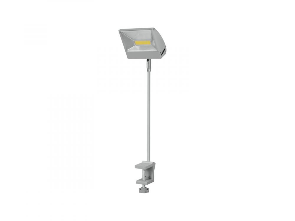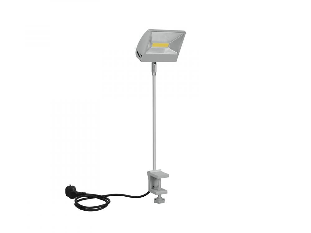 30 W LED floodlight with extension arm and screw clamp for fixation -Equipped with one 30 W COB LED, 4100 K -Perfect illumination for shop windows, booth lighting at trade exhibitions, etc. -Head tiltable 90° -Unique design -Easy mounting via screw clamp -For tabletops with up to 40 mm strength -Ready for connection with power cord and safety power plug -Switch-mode power supply for operation between 100 and 240 volts -Available in three housing colors: silver, black, white -Case color: Silver -Power connection: Fix Power supply cord with safety plug (M) -Control: without -LED: 1 x COB (chip-on-board) 30 W NW |