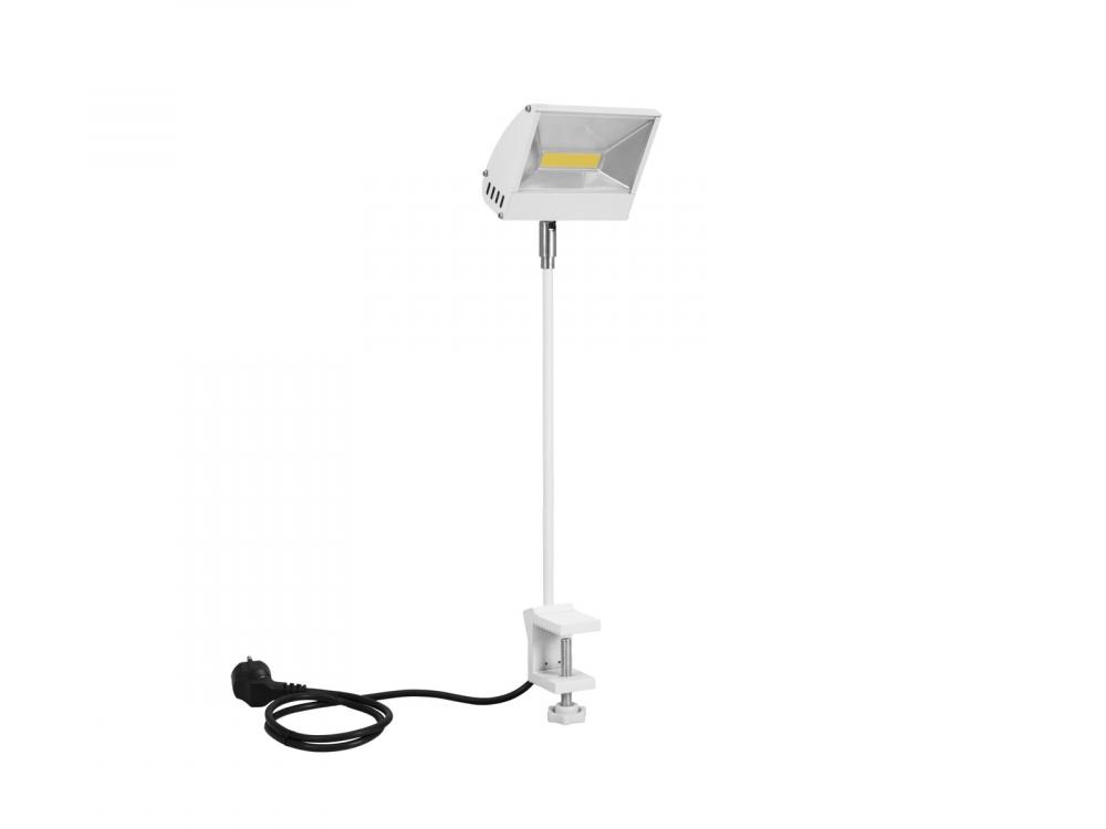 30 W LED floodlight with extension arm and screw clamp for fixation -Equipped with one 30 W COB LED, 4100 K -Perfect illumination for shop windows, booth lighting at trade exhibitions, etc. -Head tiltable 90° -Unique design -Easy mounting via screw clamp -For tabletops with up to 40 mm strength -Ready for connection with power cord and safety power plug -Switch-mode power supply for operation between 100 and 240 volts -Available in three housing colors: silver, black, white -Case color: White -Power connection: Fix Power supply cord with safety plug (M) -Control: without -LED: 1 x COB (chip-on-board) 30 W NW |