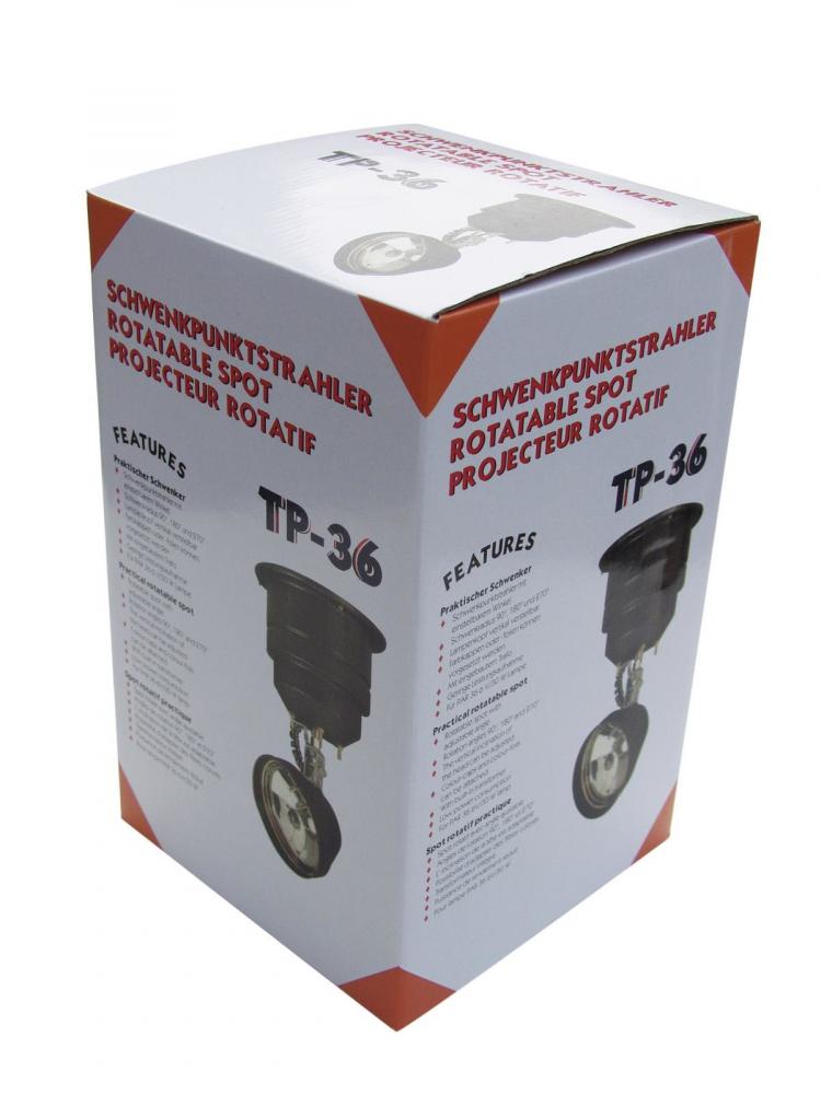Rotatable pinspot for 6 V/30 W PAR-36 lamp -Adjustable rotation angle (90°, 180°, 270°) -In the adjusted rotation angle, the lamp head moves to the left and to the right -The inclination angle of the lamp head can be adjusted -Color-caps and color-foils can be attached -With built-in transformer -Low power consumption -For 6 V/30 W PAR-36 lamp -Power plug has to be ordered separately -Case color: Black -Power connection: Fix Main input cable with open wires -Control: without |
