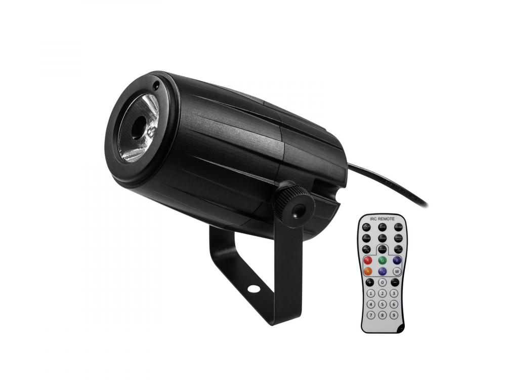 Narrow-beam pinspot with 5 W 4in1 LED in RGBW -For illuminating mirror balls, as decoration for display windows and as party room decoration -Equipped with a 5 W 4in1 LED in the colors red, green, blue and white -2 built-in auto and music show programs -Sound-control via built-in microphone -Mounting bracket for ceiling or wall mounting -Memory function -Convenient wireless control via included IR remote control EUROLITE IR-7 -Case color: Black -Effect: Strobe effect -Power connection: Fix Power supply cord with Euro plug (M) -Control: IR remote control (provided); Stand-alone -LED: 1 x high-power 5 W 4in1 QCL RGBW (homogenous color mix) |