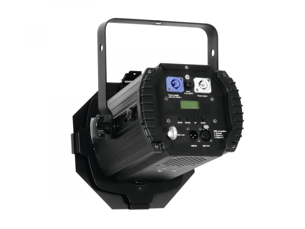 Daylight studio lighting with powerful 50 W COB LED -Compact housing in a beautiful design -Functions: dimmer, strobe effect, Master/Slave operation -Mounting bracket for installations on a stand or a crossbeam -DMX-controlled operation or stand-alone operation -1 or 3 DMX channels selectable for numerous applications -DMX512 control possible via any commercial DMX controller -Manually adjustable zoom -With color filter frame -Optional barndoors available -Different dimmer curves and dimmer speed adjustable -5600 K color temperature -Comfortable addressing and setting via Control Board with LCD display and four operating buttons -Power connection via Neutrik PowerCon jack and included power cable -Feed-through output allows to power another device -After every 8 devices, the fixtures must have a renewed connection with the power mains -Case color: Black -Projection: flicker-free -Control: Stand-alone; DMX -LED: 1 x COB (chip-on-board) 50 W CW (homogenous color mix) |