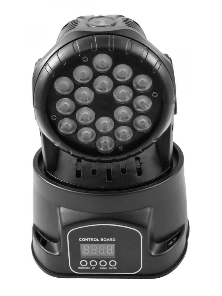 Compact washlight with 3 W tricolor LEDs and RGB color mixing -Equipped with 18 x 3 W tricolor LEDs with RGB colors -Through the close chip placement of the multichip technology, an exquisite color mix even with short distances to the illuminated surface is provided -Compact lightweight -Positioning within 540° PAN and 180° TILT -Stepless RGB color mixture -6 color macros can be called up via DMX controller -Dimmer -Strobe effect with adjustable speed -Random strobe effect -Exact positioning via 16 bit PAN/TILT movement resolution -DMX-controlled operation or stand-alone operation with Master/Slave function -Sound-controlled via built-in microphone -Control board with 4-digit LED display and foil-keyboard for adjusting the DMX-starting address, PAN/TILT Reverse, Reset -DMX control via every standard DMX controller -Case color: Black -Power connection: Mains Input Socket (M) IEC connector (M) mounting version Power supply cord with safety plug (M) (provided) -Control: Sound to light via microphone; DMX; Stand-alone -LED: 18 x high-power 3 W 3in1 TCL RGB (homogenous color mix) |