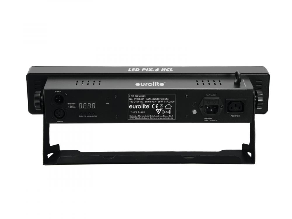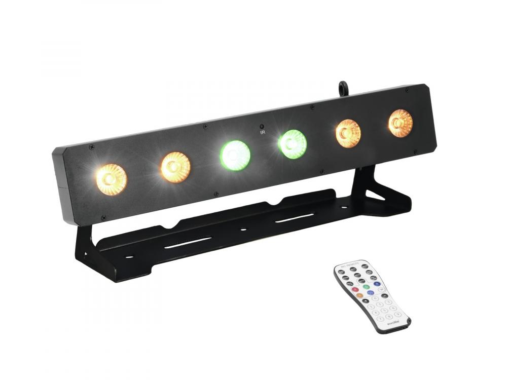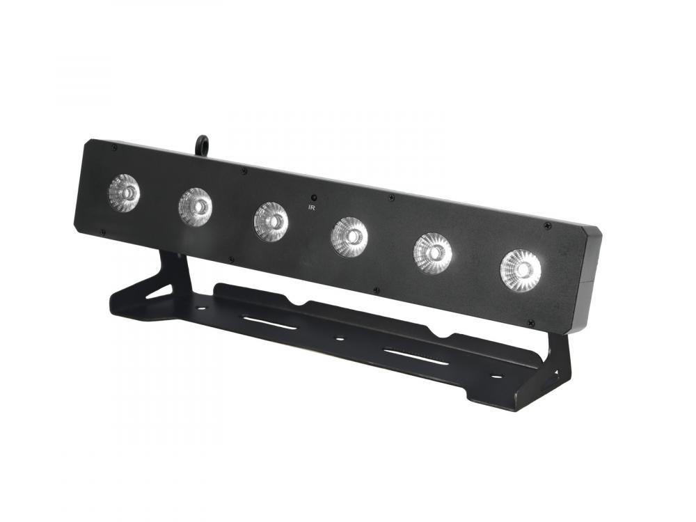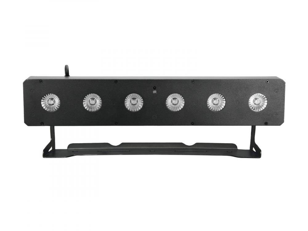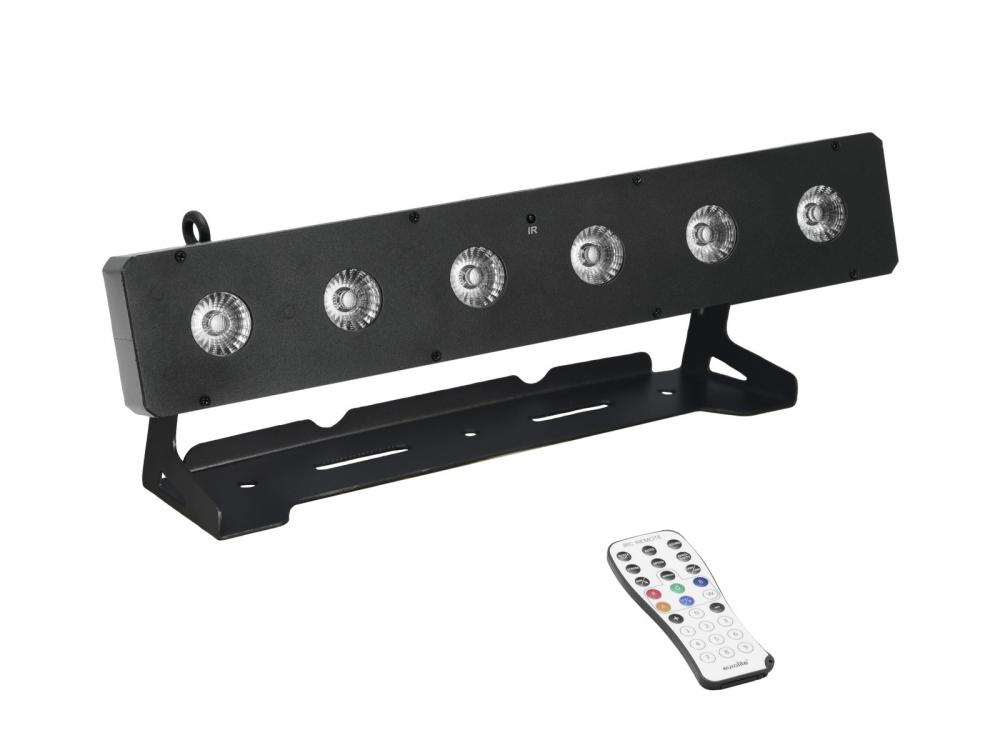 Spotlight bar (44 cm) with 6 x 10 W 6in1 LED (RGBAW+UV), pixel control -Operable in stand-alone mode or via DMX -DMX512 control possible via any commercial DMX controller (occupies max. 38 channels) -Each LED can be controlled individually -4, 6, 9, 36 or 38 DMX channels selectable for numerous applications -Sound-control via built-in microphone -Microphone sensitivity adjustable via Control Board -Comfortable addressing and setting via control board with LED display and four operating buttons -Additional controlling possibility via the EUROLITE IR-7 remote control, included in delivery -Functions: Static colors, RGBAWUV color blend, internal programs, dimmer and strobe settings via DMX, Master/Slave -Equipped with 6 x 10 W 6in1LEDs in the colors red, green, blue, amber, white and UV -Floor, ceiling or trussing installation possible -Locking possibility at the mounting bracket -Fan-cooled -Feed-through output allows to power up to 8 devices -Switch-mode power supply for operation between 100 and 240 volts -Ready for connection via enclosed IEC power cord with safety-plug -Case color: Black -Effect: Strobe effect; UV -Projection: flicker-free -Power connection: Mains Input Socket (M) IEC connector (M) mounting version Power supply cord with safety plug (M) (provided) -Power out: 1 x IEC connector (F) mounting version -Control: IR remote control (provided); Stand-alone; DMX -LED: 6 x high-power 10 W 6in1 HCL RGBWA/UV (homogenous color mix) |