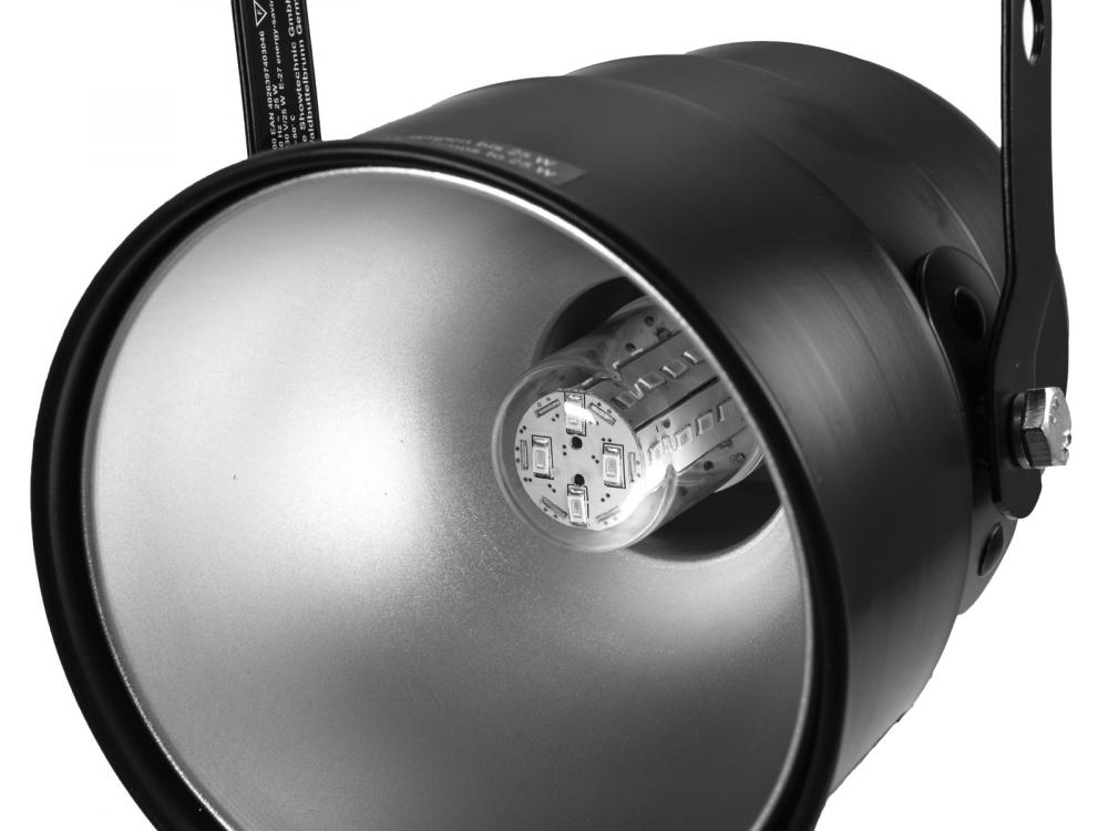 Compact UV spot with E-27 socket including 5 W UV LED -Robust metal housing with mounting bracket -High quality reflector -5 W UV LED lamp with E-27 socket included -Ready for connection via power cord with safety plug -Case color: Black -Effect: UV -Color generation: UV -Power connection: Fix Power supply cord with safety plug (M) -Control: Stand-alone -LED: 1 x SMD 5 W UV (homogenous color mix) |