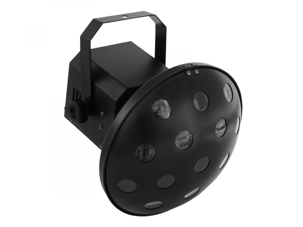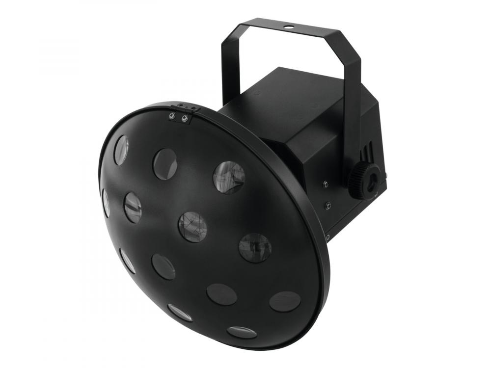 Mushroom with DMX and beams in the colors R, G, B, A, W and P -Mushroom with rotating beams in different color combinations -Equipped with six bright 3 W LEDs in red, green, blue, amber, white and pink -Operable in stand-alone mode or via DMX interface -DMX512 control possible via any commercial DMX controller (occupies 10 channels) -Comfortable addressing and setting via control panel with LED display and four operating buttons -Functions: Auto mode, internal programs, sound control mode, strobe settings and rotation via DMX, Master/Slave -Sound-control via built-in microphone -Microphone sensitivity adjustable via rotary control -Easy installation -Locking possibility at the mounting bracket -Ready for connection via power cord with safety plug -Switch-mode power supply for operation between 100 and 240 Volts -Case color: Black -Effect: Multi beam effect -Power connection: Fix Power supply cord with safety plug (M) -Control: Stand-alone; DMX -LED: 6 x high-power 3 W RGBWAP |