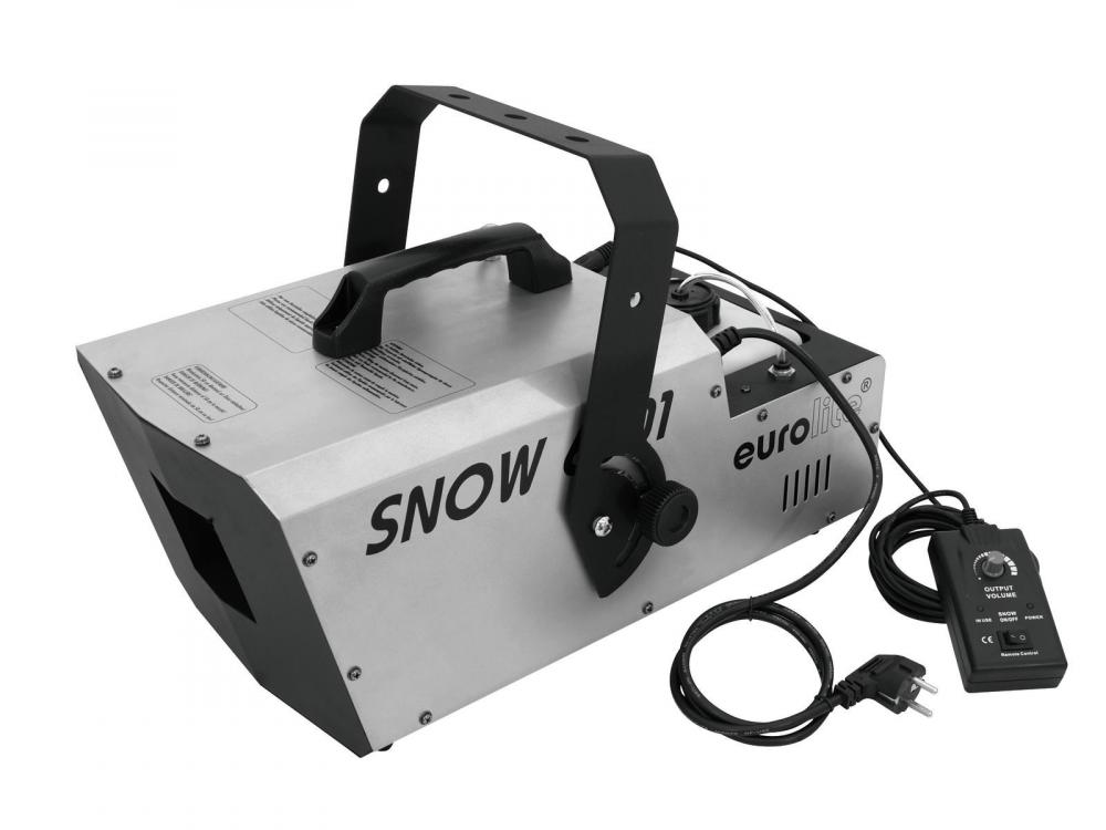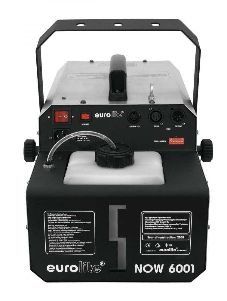 Mid-sized DMX controllable machine with cable remote control -A lot of snowflakes are thrown into the room up to a distance of 2 m -Constant snowing creates a foam/snow build up, which dissolves gradually -The dissolution of the "blanket of snow" happens nearly without residues -Snow output is controlled via the control unit at the remote control -Ideal for a "winter" subject in discos, theatres etc. -With 2.5 l tank for permanent operation -Suitable snowfluid: EUROLITE Snowfluid -DMX512 control via regular DMX controller (occupies 1 channel) -With bracket for suspended mounting -High-quality structure -High quality at a low price -Case color: Silver -Power connection: Mains Input Socket (M) IEC connector (M) mounting version Power supply cord with safety plug (M) (provided) -Control: Wired remote control (provided); DMX |