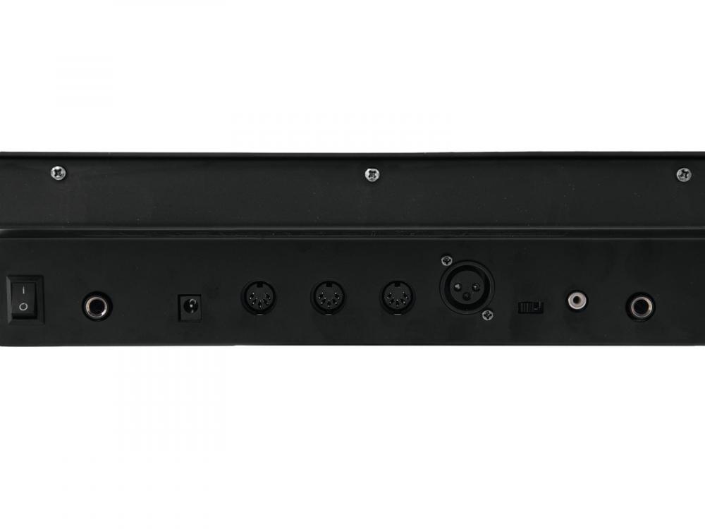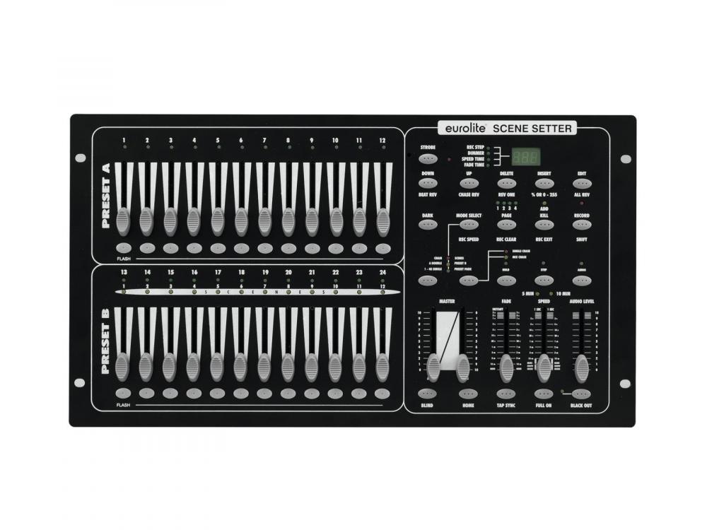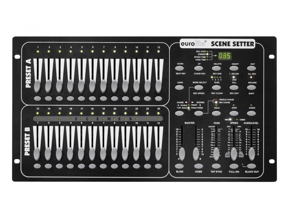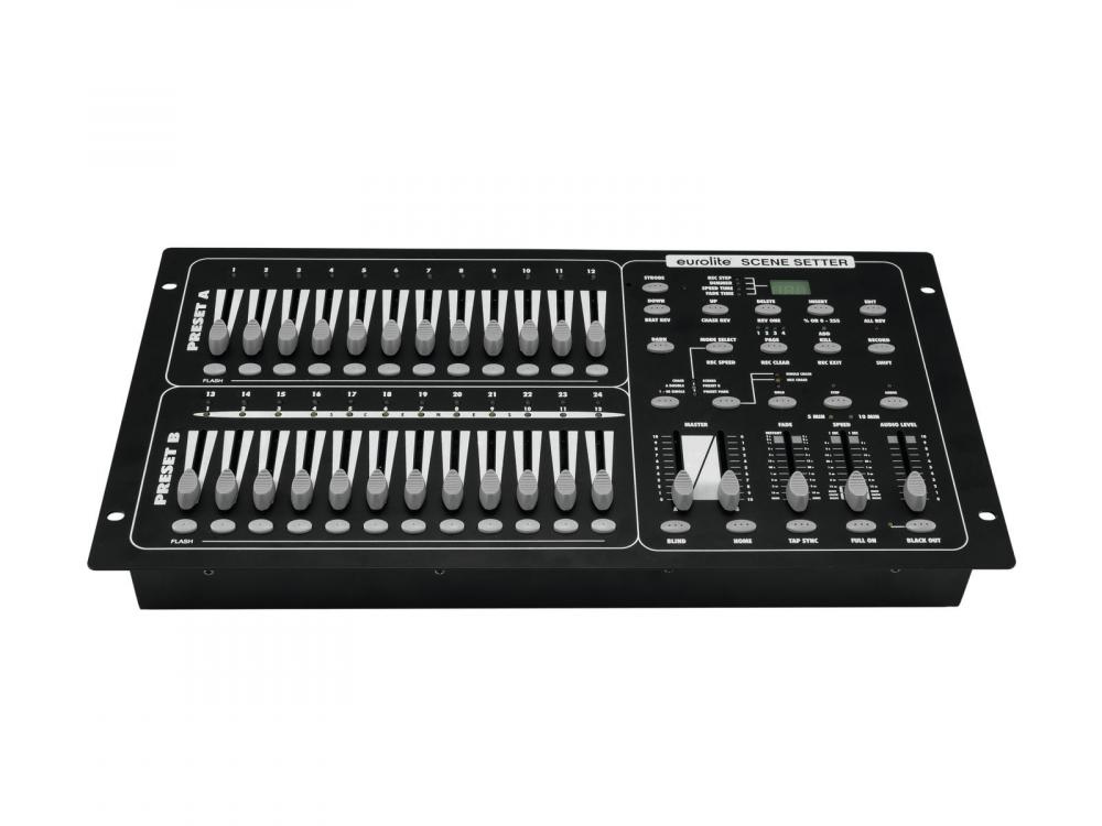 Theater light console for 24 DMX channels, brightness control for each scene -24 control channels -48 memorizable programs via 4 pages -12 scenes can be called up directly via the faders -Blackout function -Mix and single chase function -Blind/home function -Sound control via built-in microphone or via line input -Supports standard MIDI -3-pin XLR connector with polarity selector -Footswitch control possible -Desktop console -Rack installation with 6 units -Case color: Black -Housing design: (19") 48,3 cm rack installation -Height unit: 6 U -Power connection: Mains Input Socket (M) Coaxial power connector (M) Power supply cord with AC adapter (m) (provided) -Controller useable for: general mix of colors; Controls KLS in general; Controls DMX effects; Luminaires for white -Control: DMX |
