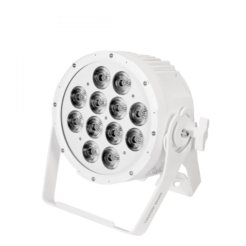 The luminaire shall be an IP-65 Marine Grade PAR color changer with white housing and (12) 12W 6-IN-1 RGBAW+UV LEDs. The luminaire shall operate flicker-free with an average LED life of 100,000 hours. The luminaire shall be capable of emitting 2,500 Lux @ 3m. It shall include color and chase macros and have 15° beam and 25° field angles. The luminaire shall house an electronic strobe and be capable of 0-100% dimming with 5 variable dimming curve modes. The luminaire shall operate via DMX and RDM and include a 4-button touch control panel and LCD menu display. IP DMX In/Out and IP Power In/Out connections shall be included. Exterior construction shall be of white die-cast aluminum and the luminaire shall contain a dual yoke / floor stand. Multiple unit power linking shall be possible and the unit shall have no fans. Max power consumption shall be 150W and a multi-voltage universal auto switching power supply (110-250v) shall be included. It shall measure 313mm x 157mm x 300mm (LxWxH) and weigh 5.7 kg.
